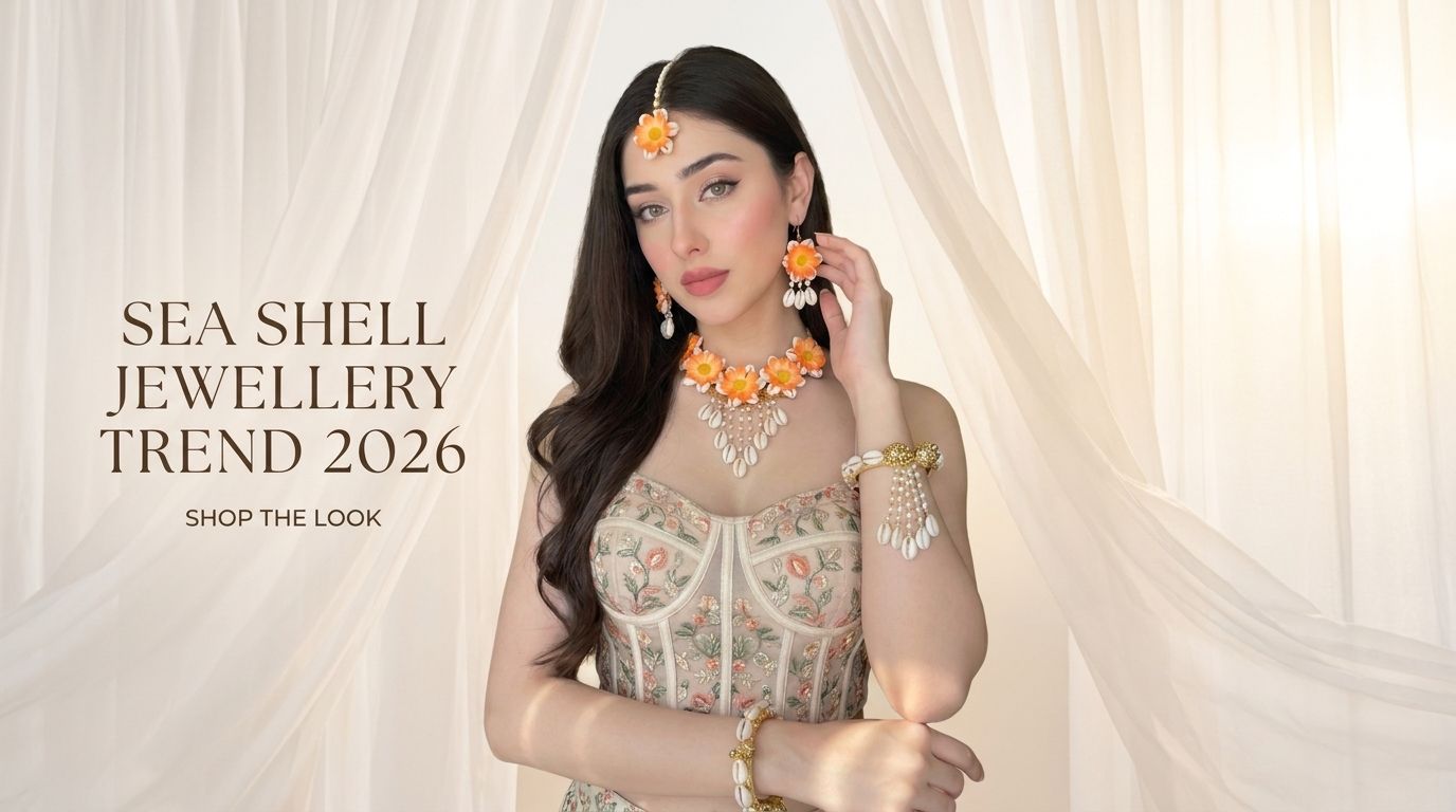 Sea shell jewellery trend 2026 is all about conscious choices. Handcrafted from real shells, paired up with pearls, tiny mirror accents, or woven with threadwork. If you’re browsing handmade jewellery online, you’ve definitely spotted “custom cowrie earrings” or “haldi jewellery sea shell combo set”—and noticed half of them are already sold out. (Trust me, cart it fast.)