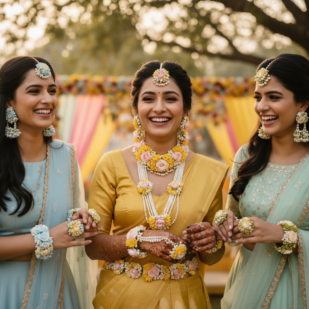A Haldi Mehndi Jewellery set typically includes floral or artificial jewellery pieces such as necklaces, earrings, maang tikka, bangles, and haath phool. These sets are specially designed for Haldi and Mehndi ceremonies, adding elegance and color to bridal jewellery.