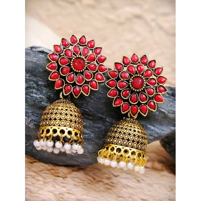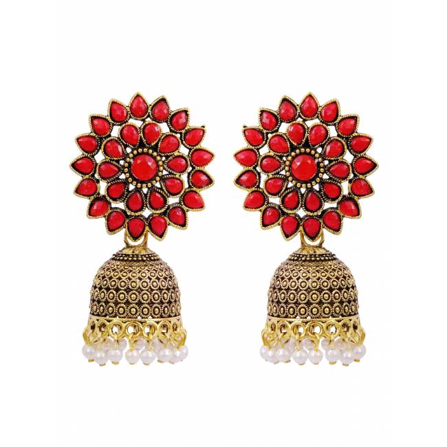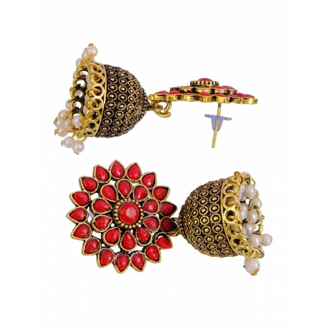 Gold Plated Meenakari Floral Red Jhumka Earrings With White Pearl RAE0903