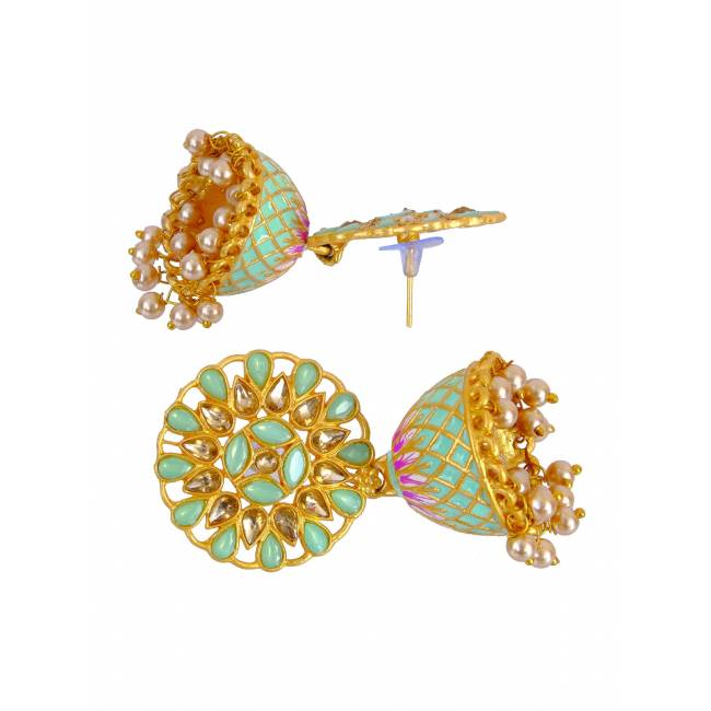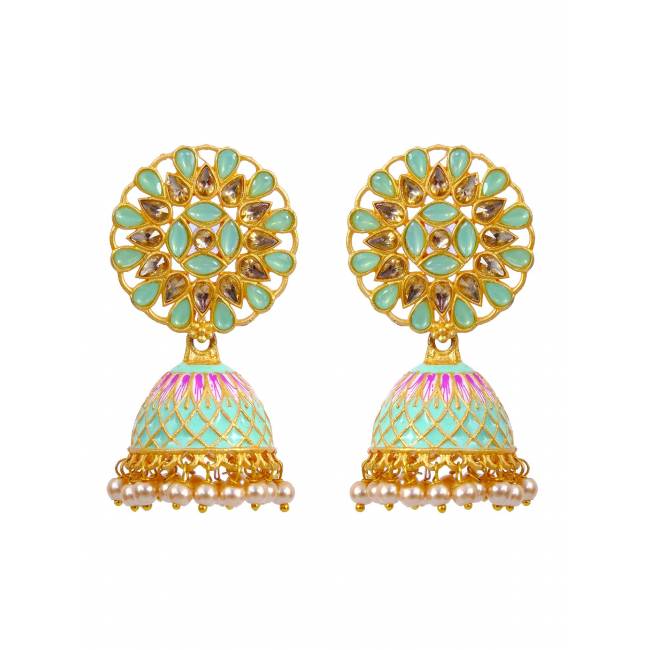 Indian Traditional Gold Plated Sea Green Floral Kundan Jhumka Earring RAE0807